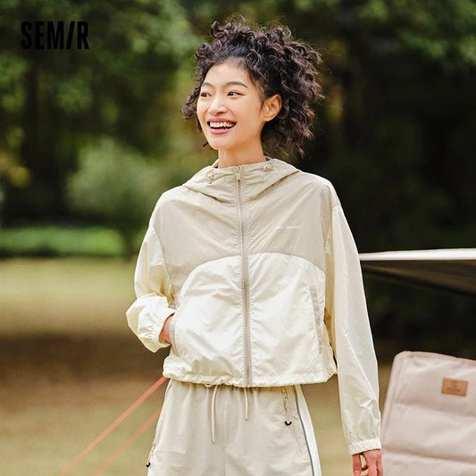 Semir Women Short Hooded Jacket 2024 Summer New Loose Fit Cool Sun Protection Jacket Textured Color Block Retro